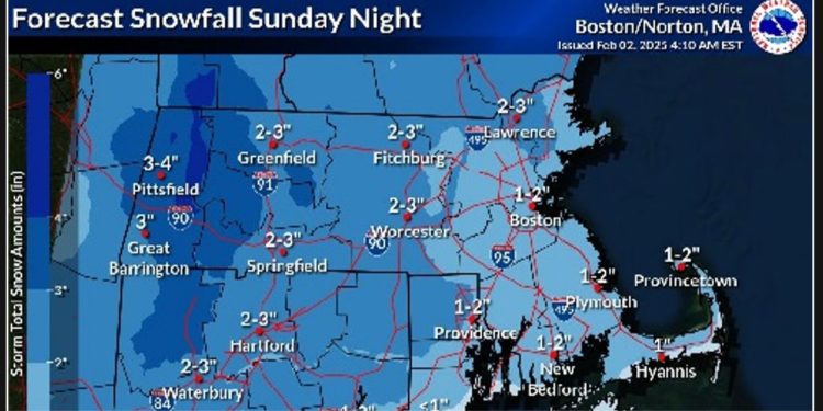 Tonight, a quick-moving clipper system is forecasted to bring light snow to the region. We can expect 1-3 inches of snow across the area, with western Massachusetts possibly experiencing localized spots of 4-5 inches.