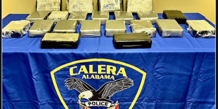Calera Police Chief David Hyche said a patrol officer stopped a vehicle going through town last week because it did not have a tag. During the stop, Hyche stated, “Probable cause for a search was evident,” which resulted in the finding of 46 pounds of cocaine.