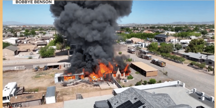 A home in the West Valley area of Maricopa County, AZ, located off 87th Avenue and Deer Valley Road, was engulfed in flames on Thursday morning. A neighbor captured drone footage shortly after the incident occurred.