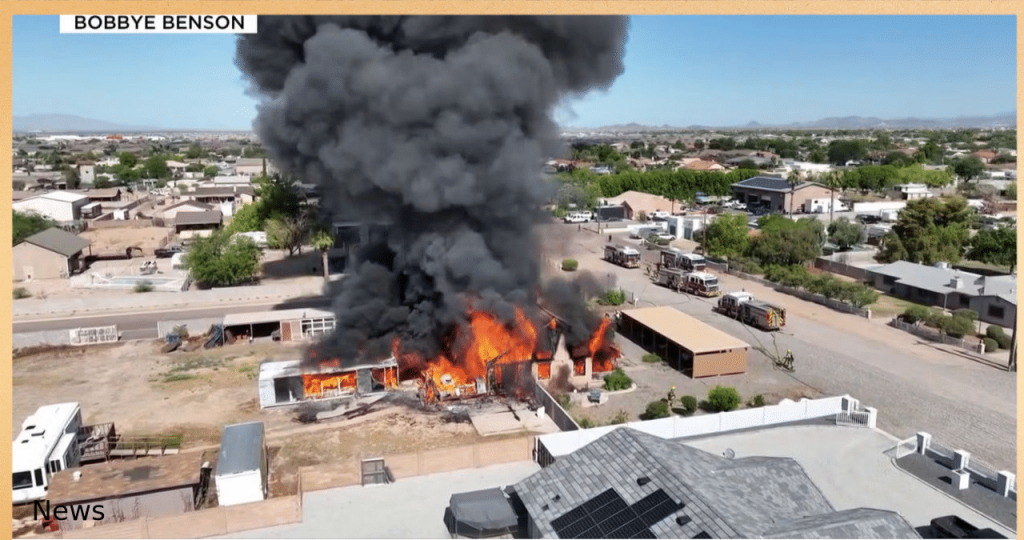 A home in the West Valley area of Maricopa County, AZ, located off 87th Avenue and Deer Valley Road, was engulfed in flames on Thursday morning. A neighbor captured drone footage shortly after the incident occurred.