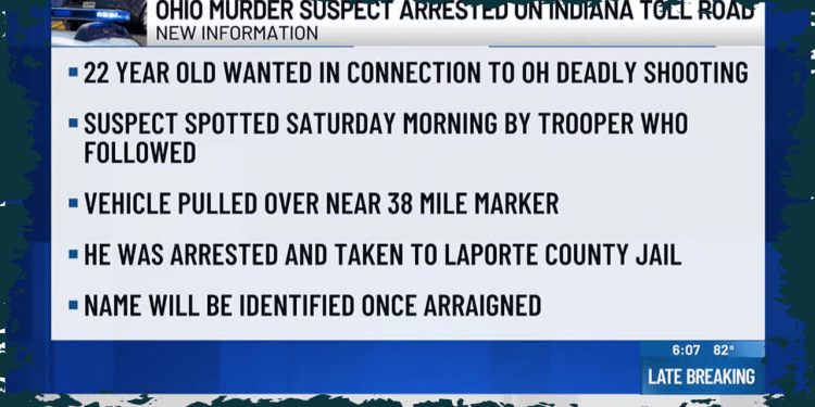 According to a news release by the state police on Sunday, an Ohio murder suspect was apprehended by Indiana State Police troopers on the Indiana Toll Road on Saturday.
