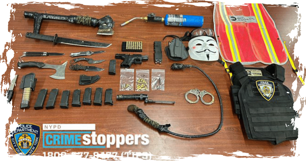Upon conducting a thorough search of the suspect’s vehicle, law enforcement officials discovered an assortment of weapons and items, which included a 9mm handgun, nine magazines fully loaded with ammunition, body armor, handcuffs, several uniform items belonging to the NYPD, two axes, a stun gun, multiple knives, a weighted whip, and an expandable baton.