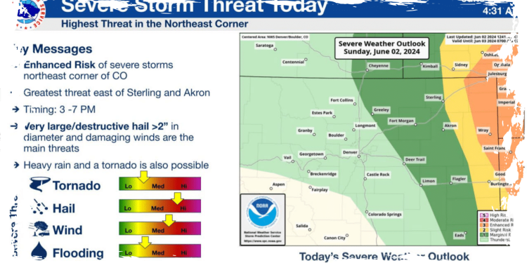 Severe weather is anticipated to develop in northeastern Colorado on Sunday, bringing with it the potential for large and destructive hail. The late afternoon and evening hours are expected to be particularly vulnerable to this hazardous weather phenomenon.