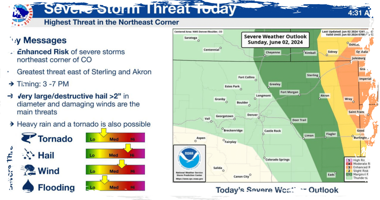 Greeley, Fort Morgan, Limon, Sterling, and Akron communities are currently at a marginal risk for severe weather.