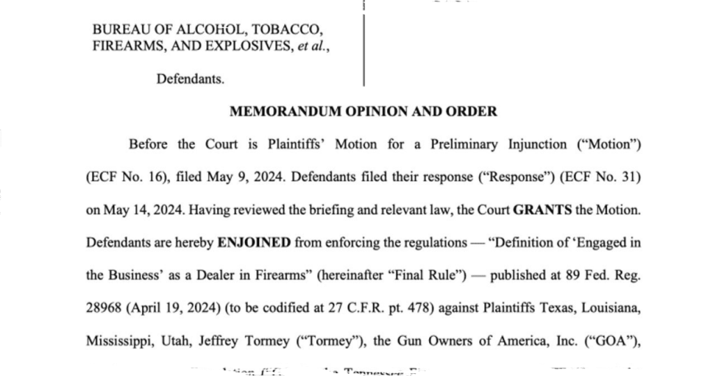 A new rule by the Bureau of Alcohol, Tobacco, Firearms and Explosives that changes the definition of a firearms dealer in four states and for members of four organizations has been granted an injunction by a federal judge in Texas, preventing the agency from enforcing it.
