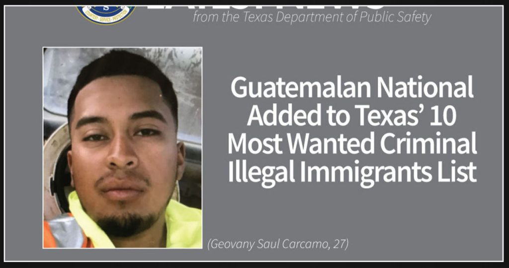The Texas Department of Public Safety announced that Geovany Saul Carcamo, a Guatemalan national, has been added to the Texas 10 Most Wanted Criminal Illegal Immigrants List. They are offering a cash reward of up to $3,000 for any information that can lead to his arrest.