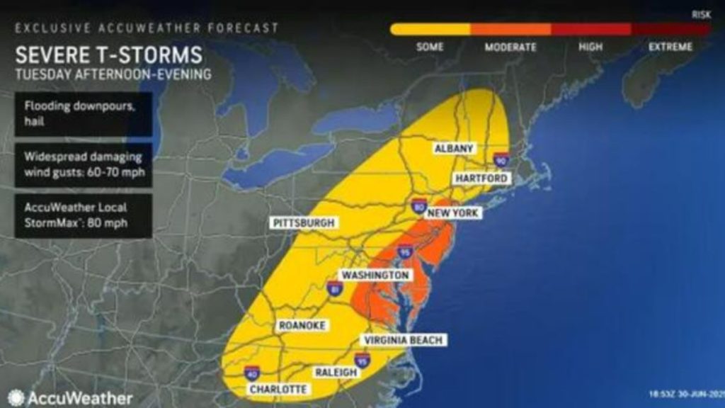 “Flooding downpours, hail and damaging wind gusts will be the primary threats in any severe thunderstorm that erupts,” according to AccuWeather meteorologist Peyton Simmers. “These thunderstorms can slow down the evening commute along parts of the I-95 corridor including in New York City, Philadelphia and Washington, DC.”