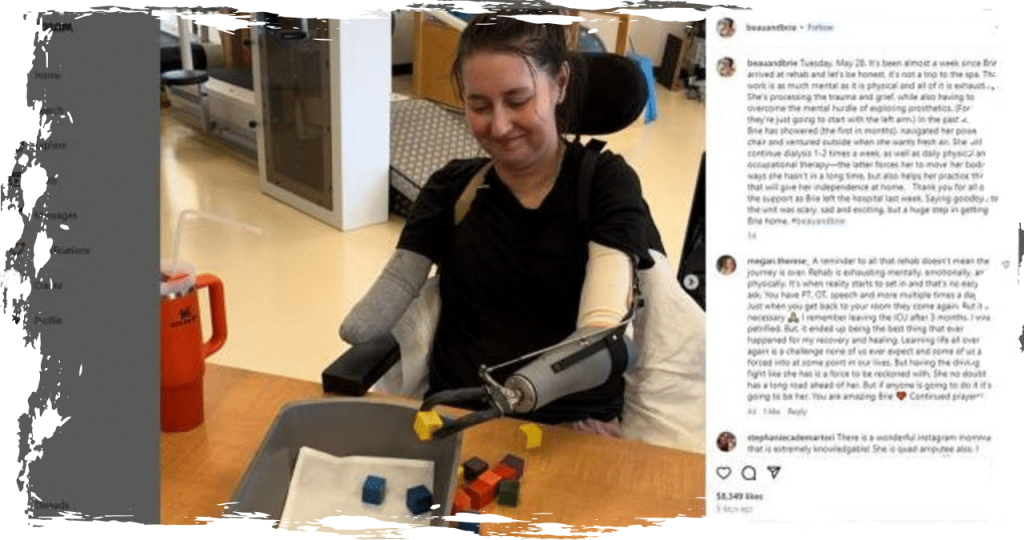 “What a difference a week and a half makes!” exclaims the post. “We are incredibly proud of our girl for absolutely dominating her rehab! A heartfelt thank you goes out to the amazing OT and PT teams who have been instrumental in helping her overcome obstacles. Keep pushing forward, Brie!”
