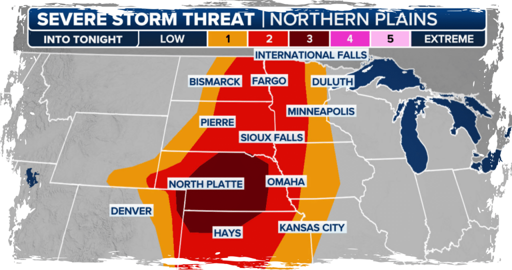 The risk area encompasses several locations, including Grand Island, Kearney, North Platte, Norfolk, Nebraska, and areas northwest of Kansas City, Kansas.