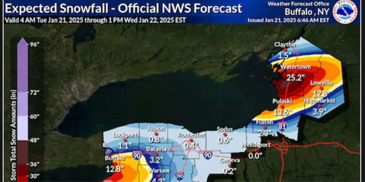 Residents in the areas east of New York’s Great Lakes should be ready for more snow in the coming hours. The National Weather Service predicts that certain towns may receive up to 2 feet of additional snow by Tuesday night, in addition to what has already fallen.