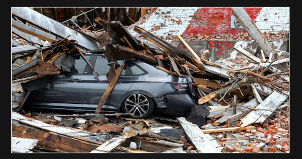 ABC News reports that the tornado left a car on its roof in a parking lot, bent street signs, and fallen tree limbs across roads and sidewalks.
