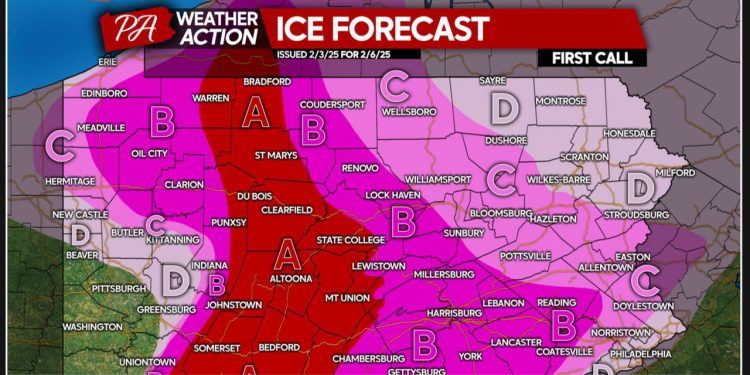 In Area D, we can expect a light ice buildup, with approximately 1/100 to 1/20 inch of ice accumulation. Although this may not seem like much, it can still create slippery conditions on surfaces. It’s important to note that Eastern PA might experience slower temperature warming compared to areas near Pittsburgh, making the surfaces even more treacherous.