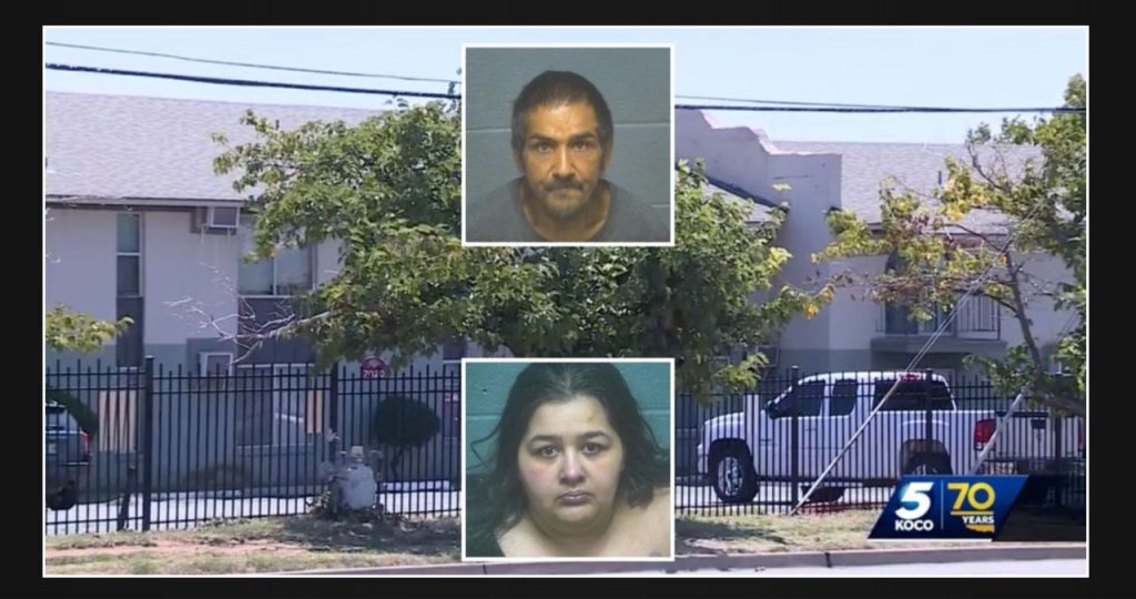 At the Oklahoma County Detention Center, Anthony Yonko and Lisa Mitchell are pictured from top to bottom. The background of the photo features the apartment complex where the couple was residing at the time of their daughter’s death. This image was captured by KOCO.