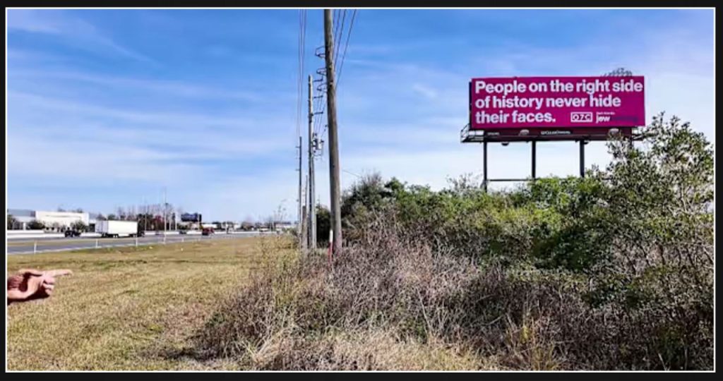 One billboard reads, “People on the right side of history never hide their faces.” Another on the opposite side of the Beachline states, “I need to be able to tell my children I did not stay silent.”