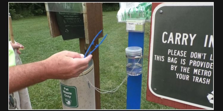 At a park, next to the trash bag station designated for pets, there is a tick collection station. The station consists of a clear jar filled with ticks and attached to a pole. Additionally, a pair of tweezers dangles from the post, making it easy for park-goers to pluck ticks off themselves. The Ohio State Department of Health is requesting the public’s help in collecting ticks at home and donating them to their county public health department. From there, the ticks will be sent to the Ohio State Department of Health for research purposes.