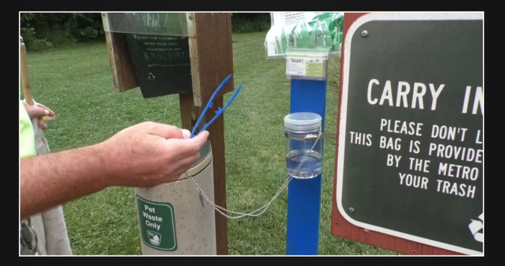 At a park, next to the trash bag station designated for pets, there is a tick collection station. The station consists of a clear jar filled with ticks and attached to a pole. Additionally, a pair of tweezers dangles from the post, making it easy for park-goers to pluck ticks off themselves. The Ohio State Department of Health is requesting the public’s help in collecting ticks at home and donating them to their county public health department. From there, the ticks will be sent to the Ohio State Department of Health for research purposes.