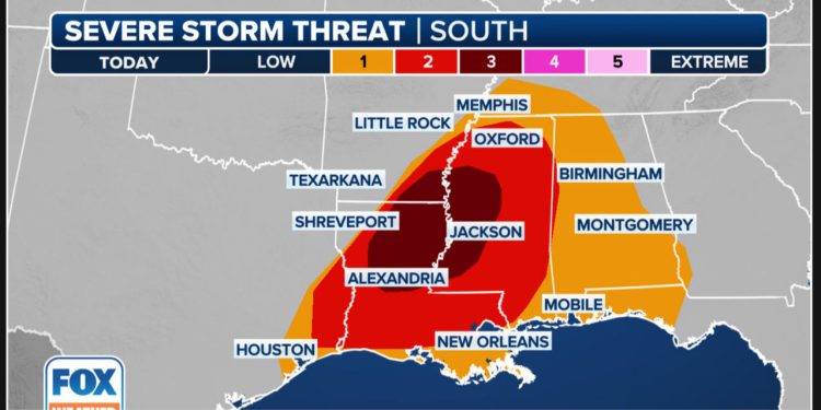 The NOAA Storm Prediction Center issued a Level 3 out of 5 risk of severe weather over northern Louisiana, western Mississippi, and southeastern Arkansas, where severe thunderstorms posed the greatest threat. Tornadoes with an EF-2 rating or higher were possible in the region.