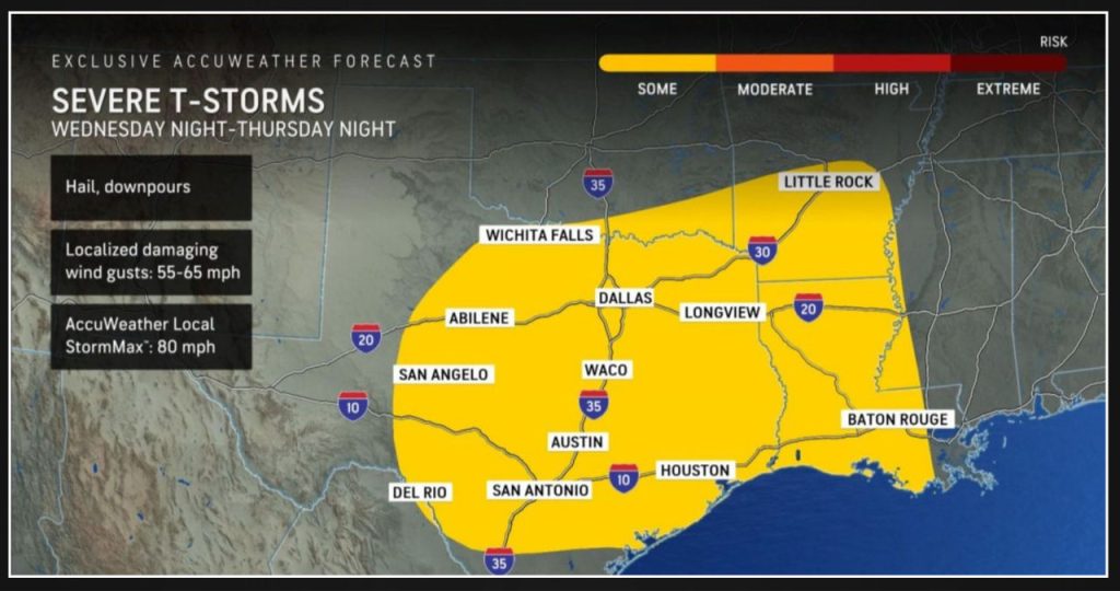 Starting Wednesday night, a forecast map from AccuWeather reveals a potential for severe thunderstorms in various regions of central, eastern, and southern Texas. These severe weather conditions are expected to persist until Thursday night.