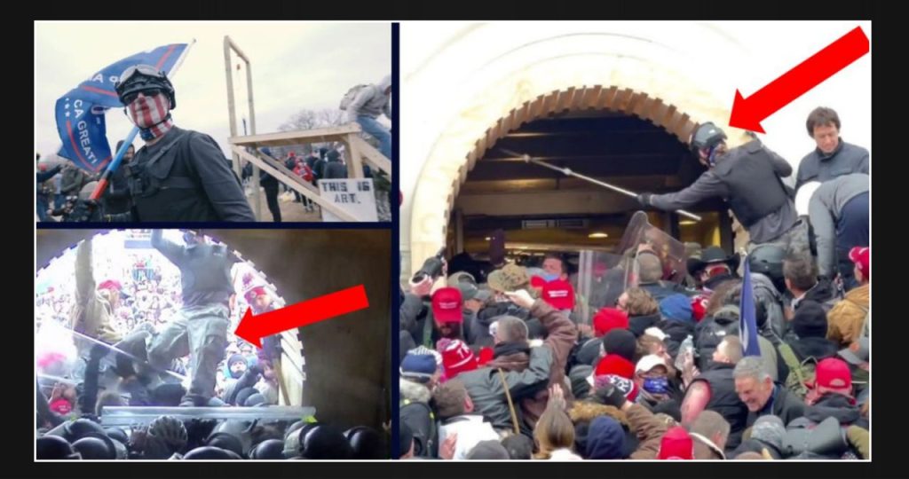 In this image, we see David Nicholas Dempsey in three different instances during the January 6, 2021 riot at the U.S. Capitol. In the first photo, he is giving an interview in front of gallows that were erected during the riot. In the second photo, Dempsey can be seen climbing over fellow rioters at the entryway to the Capitol’s lower west terrace tunnel before using a long pole to attack police. Finally, in the third photo, Dempsey is seen clinging to the tunnel frame and using his feet to stomp on a police officer’s head. These actions have resulted in Dempsey facing charges by the Department of Justice.