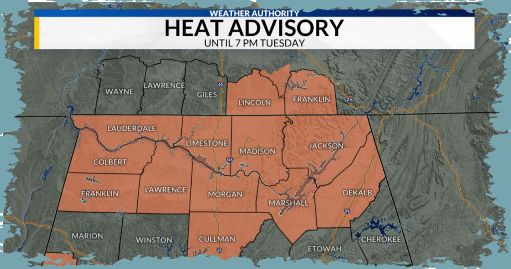 The National Weather Service has released a Heat Advisory until 7 p.m. on Tuesday due to the expected heat index values to exceed 105 degrees in the afternoon. This advisory will cover all counties located in North Alabama, in addition to Franklin, Lincoln, and Moore counties situated in Tennessee.