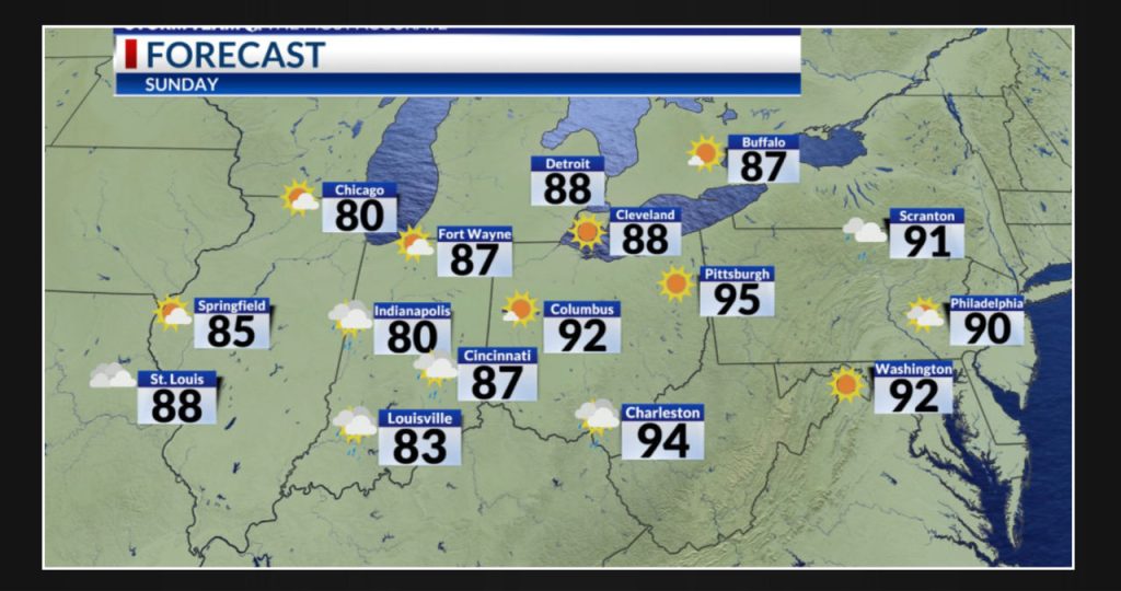 On Sunday, readings shot up into the low 90s due to a warm-up brought about by the shift of high pressure towards the Northeast and the change in wind direction to southerly. This allowed for the influx of humid air from the south, which flowed into the Ohio Valley.