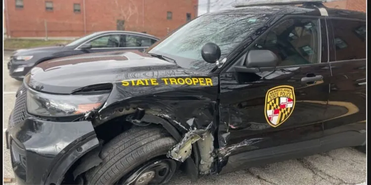 Late Friday night, a Maryland State Police trooper from the Golden Ring Barrack was sitting in her marked patrol vehicle with the emergency lights on. Suddenly, a Honda HR-V driven by Harriet Penniman Van Kleeck of Towson veered across two lanes and collided with the cruiser.